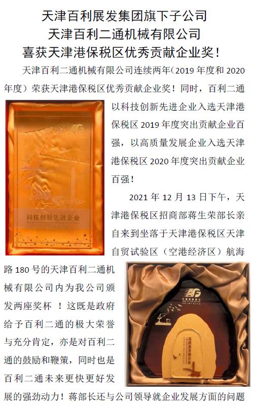 天津百利二通機械有限公司 喜獲天津港保稅區(qū)優(yōu)秀貢獻企業(yè)獎