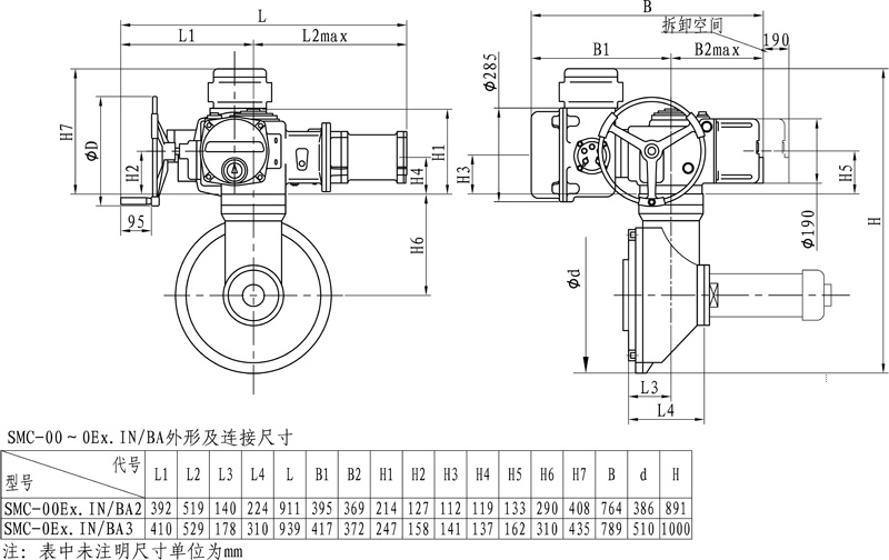 SMC/BA系列電動(dòng)裝置是SMC系列中小轉(zhuǎn)矩多回轉(zhuǎn)電動(dòng)裝置與BA圓錐齒輪減速器的一種組合型式,它適合閘閥、截止閥等多回轉(zhuǎn)閥門(mén)的驅(qū)動(dòng)控制。SMC/BA電動(dòng)裝置具有以下特點(diǎn):以較小轉(zhuǎn)矩規(guī)格的SMC電動(dòng)裝置與BA減速器組合可獲得更大的輸出轉(zhuǎn)矩。在輸出轉(zhuǎn)速允許的條件下,選用該產(chǎn)品能夠提高所選電動(dòng)裝置規(guī)格的通用性,便于產(chǎn)品的使用、維護(hù)。