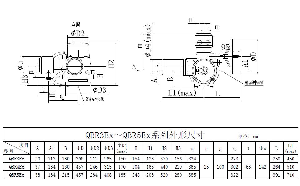 QBR3~QBR5是我公司研制的部分回轉閥門電動裝置,控制轉矩范圍:900N.m~12000N.m。該電動裝置可與球閥﹑蝶閥等閥瓣做90°回轉的閥門組合成電動閥門,其功能是控制閥門的啟閉。該電動裝置能夠進行單機或多機室內(nèi)控制遠距離控制電動操作和現(xiàn)場手動或電動操作,可廣泛地應用在具有管道閥門的工業(yè)系統(tǒng)。該產(chǎn)品的防護等級為IP67,隔爆型產(chǎn)品(型號中有Ex)的隔爆等級 為dⅡBT4。