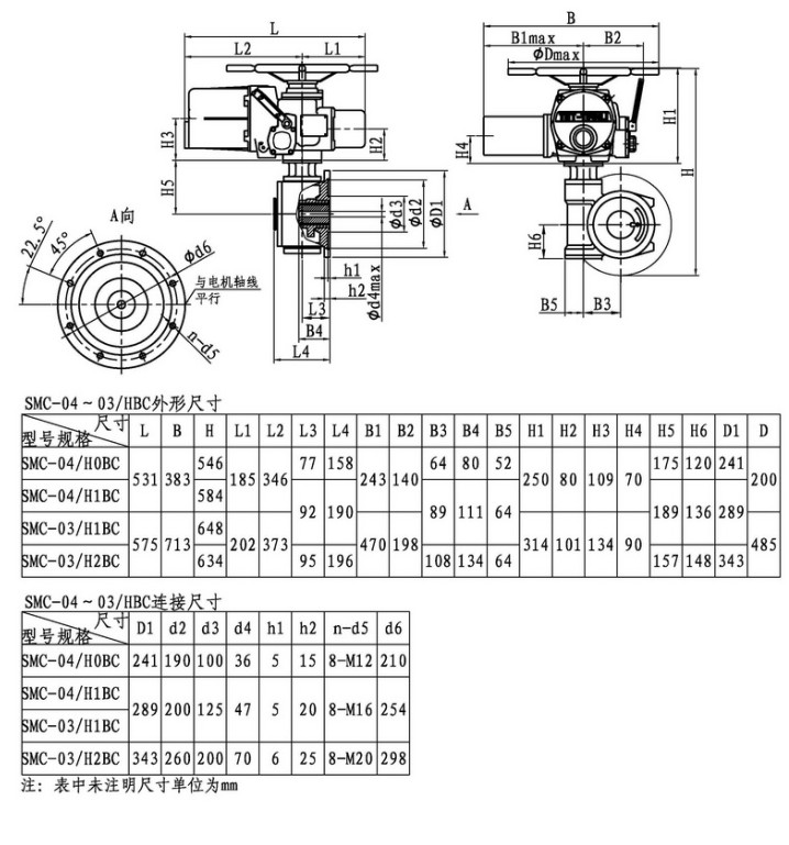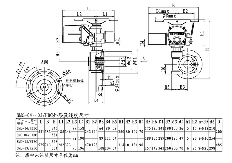 SMC/HBC系列電動裝置是SMC系列多回轉(zhuǎn)電動裝置與HBC蝸輪減速器的組合型式,它適合球閥、蝶閥等部分回轉(zhuǎn)閥門的驅(qū)動控制。SMC/HBC電動裝置具有以下特點:結(jié)構(gòu)設(shè)計堅固可靠,產(chǎn)品規(guī)格齊全,驅(qū)動轉(zhuǎn)矩范圍大且動力輸出穩(wěn)定, 具有良好的自鎖性能。 HBC輸出軸結(jié)構(gòu)獨特,裝有與閥桿連接的漸開線花鍵接頭,產(chǎn)品的安裝調(diào)試方便。