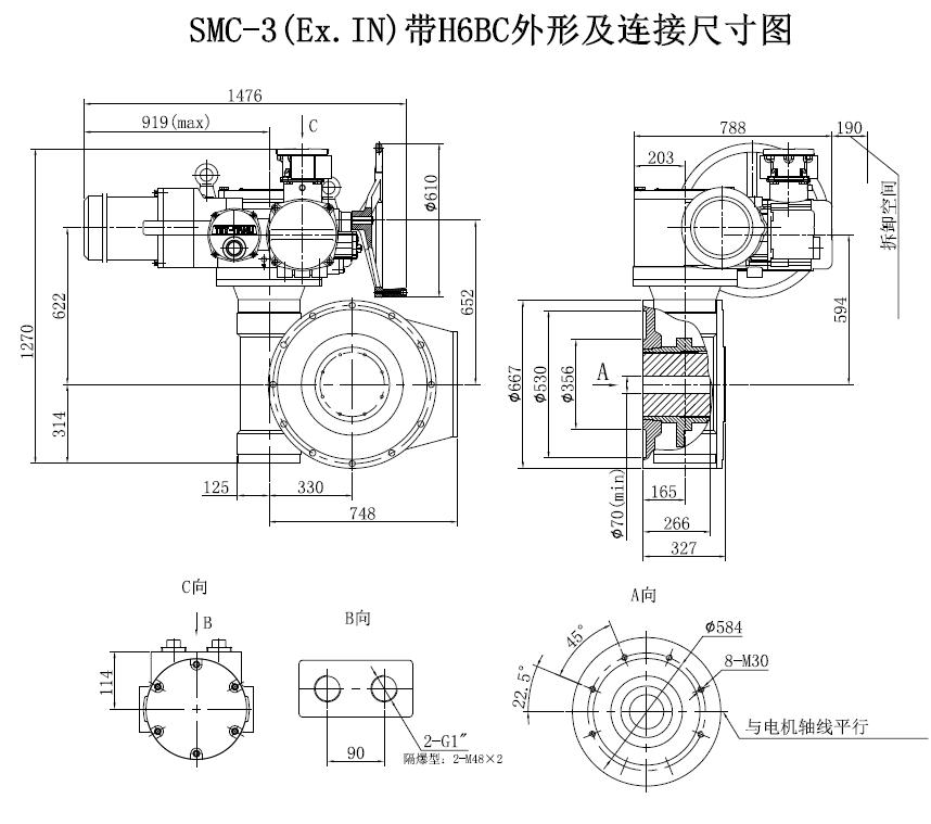 SMC/HBC系列電動(dòng)裝置是SMC系列多回轉(zhuǎn)電動(dòng)裝置與HBC蝸輪減速器的組合型式,它適合球閥、蝶閥等部分回轉(zhuǎn)閥門(mén)的驅(qū)動(dòng)控制。SMC/HBC電動(dòng)裝置具有以下特點(diǎn):結(jié)構(gòu)設(shè)計(jì)堅(jiān)固可靠,產(chǎn)品規(guī)格齊全,驅(qū)動(dòng)轉(zhuǎn)矩范圍大且動(dòng)力輸出穩(wěn)定, 具有良好的自鎖性能。 HBC輸出軸結(jié)構(gòu)獨(dú)特,裝有與閥桿連接的漸開(kāi)線花鍵接頭,產(chǎn)品的安裝調(diào)試方便。