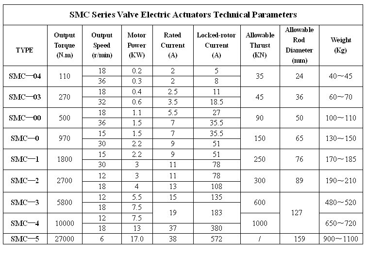 The SMC series which is introduced Limitorque technology from USA is a kind of muti-turn valve electric actuator. It has been widely used to petroleum, chemical engineering ,metallurgy, electric power ,military ,municipal ,light industry ,food and other fields. It is possible to control a machine locally or remotely. This series has a lot of type specifications such as general type, explosion-proof type, integrated type, integrated explosion-proof  and so on.