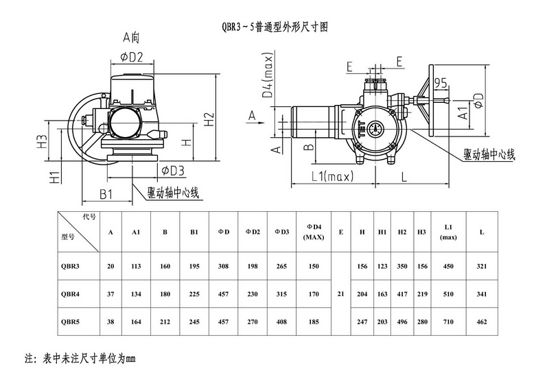 QBR3~QBR5是我公司研制的部分回轉閥門電動裝置,控制轉矩范圍:900N.m~12000N.m。該電動裝置可與球閥﹑蝶閥等閥瓣做90°回轉的閥門組合成電動閥門,其功能是控制閥門的啟閉。該電動裝置能夠進行單機或多機室內(nèi)控制遠距離控制電動操作和現(xiàn)場手動或電動操作,可廣泛地應用在具有管道閥門的工業(yè)系統(tǒng)。該產(chǎn)品的防護等級為IP67,隔爆型產(chǎn)品(型號中有Ex)的隔爆等級 為dⅡBT4。